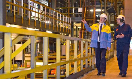 George Osborne speaks with with works manager Richard O’Neil (R) on a visit to Tata Steel in Wales